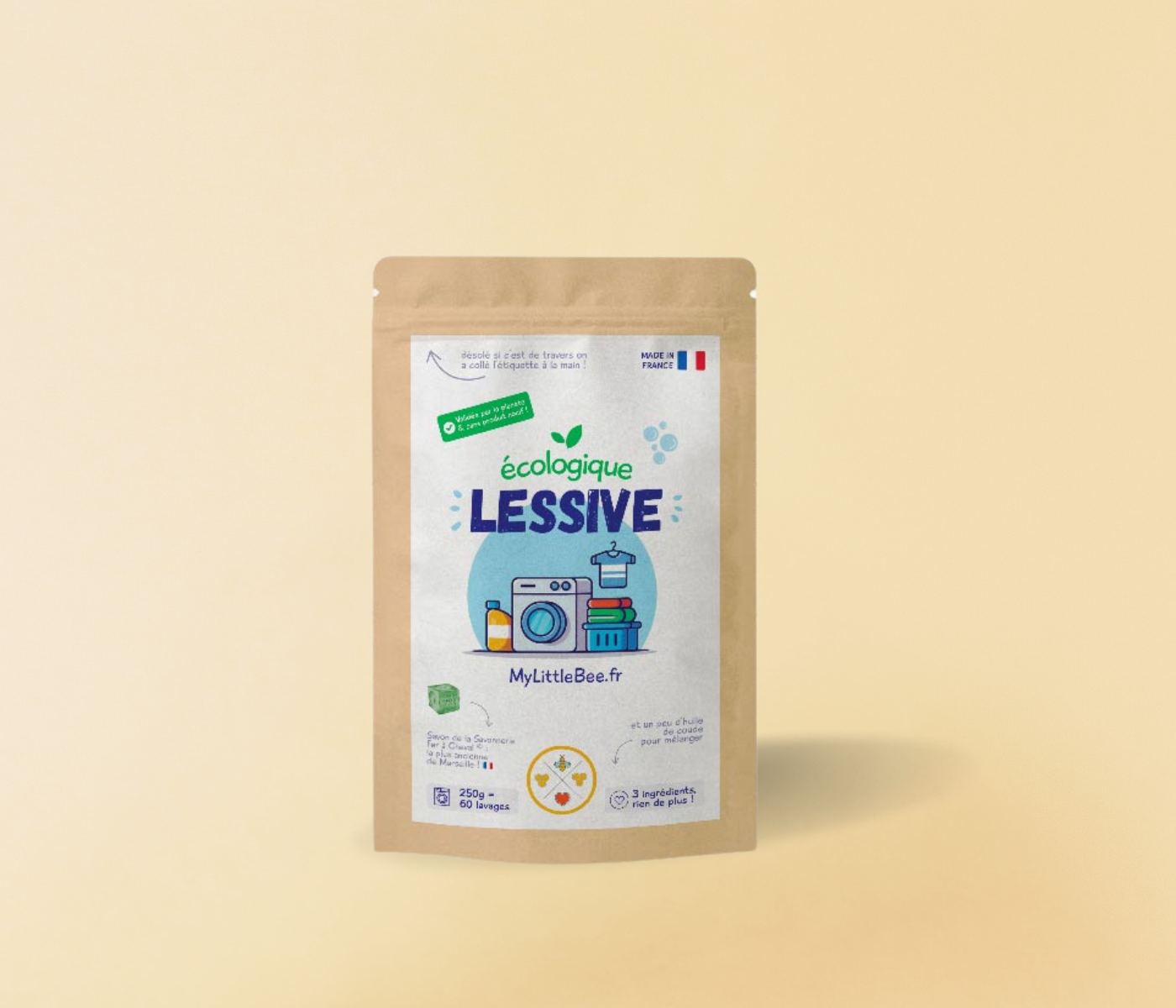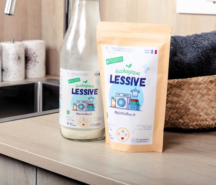 - Ajoutez 50gr (3 cuillères à soupe bien bombées) de lessive en poudre MyLittleBee dans une bouteille